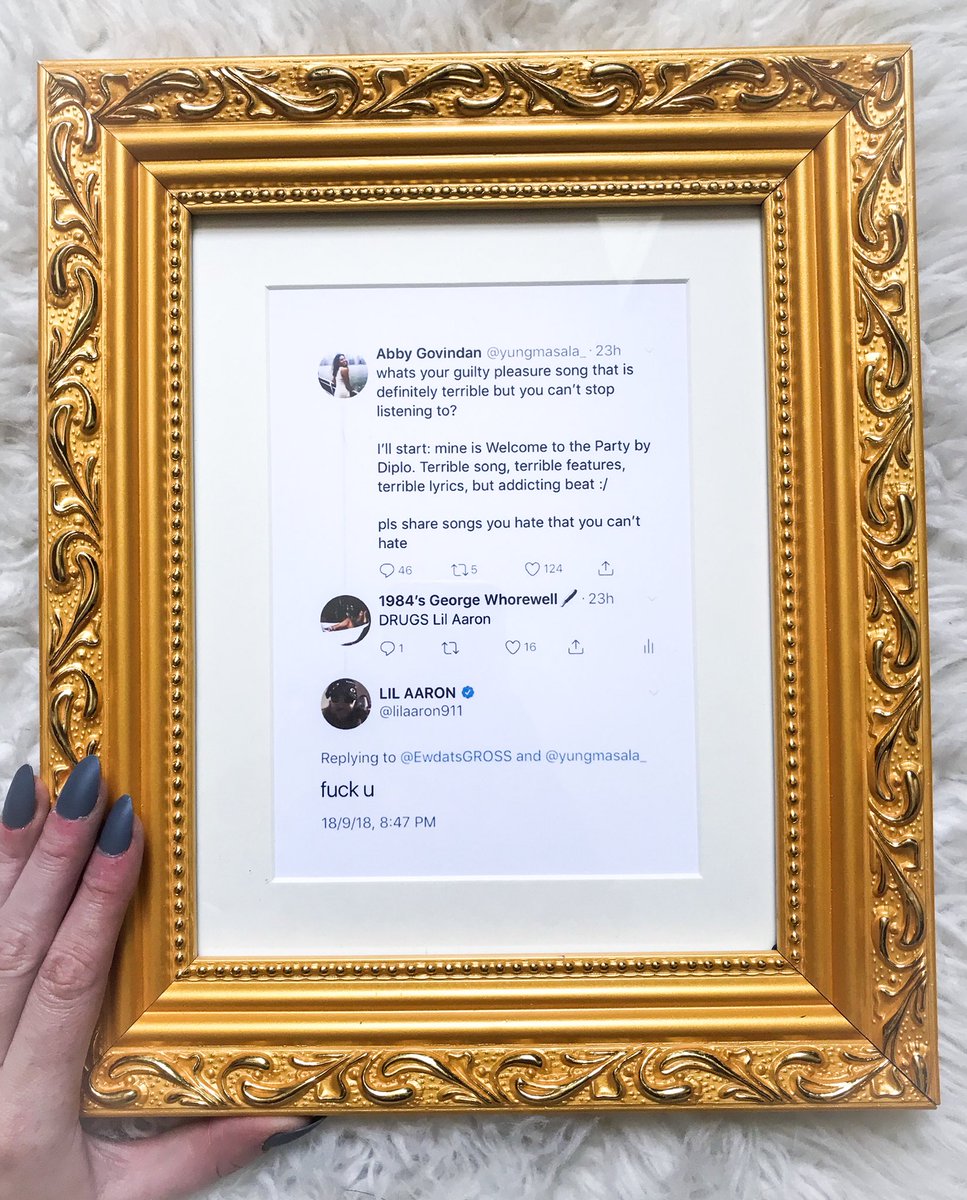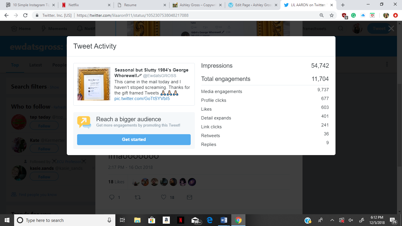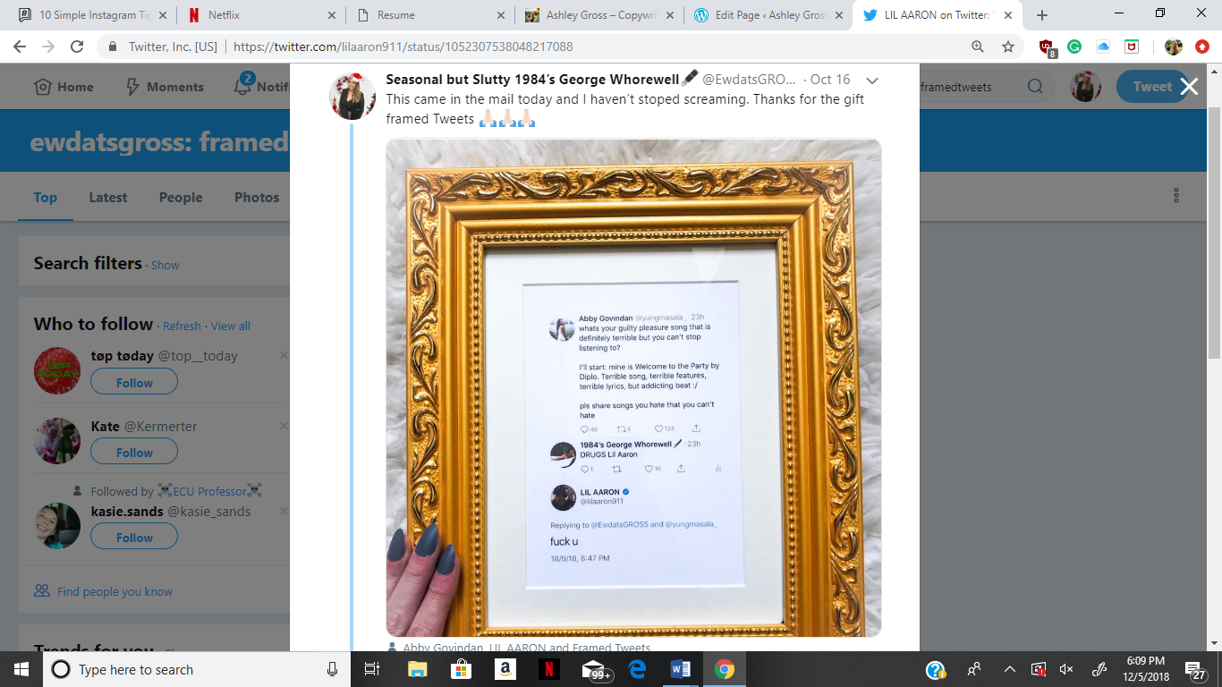 Popular online novelty service, Framed Tweets, asked to partner with me on their influencer marketing campaign. I was given a framed copy of one of my twitter interactions, which I then styled, photographed, and posted on my account, achieving nearly 55,000 impressions. I am also being considered for their program that involves my tweets being sold on mugs, stickers, pillows, and more.